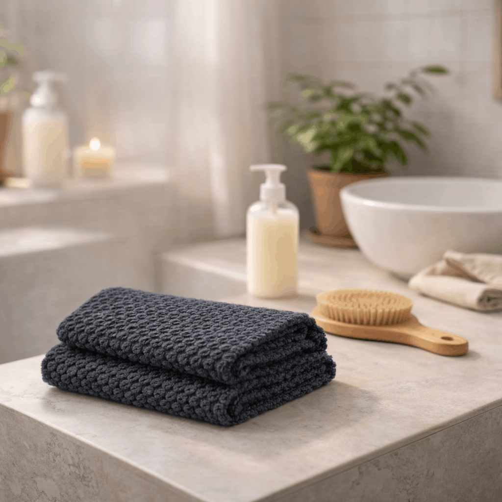 Nasze akcesoria zostały zaprojektowane tak, aby wspierać skórę, a nie ją obciążać, oraz naturalnie wpisywać się w codzienne momenty — prysznic, kąpiel, pielęgnację.